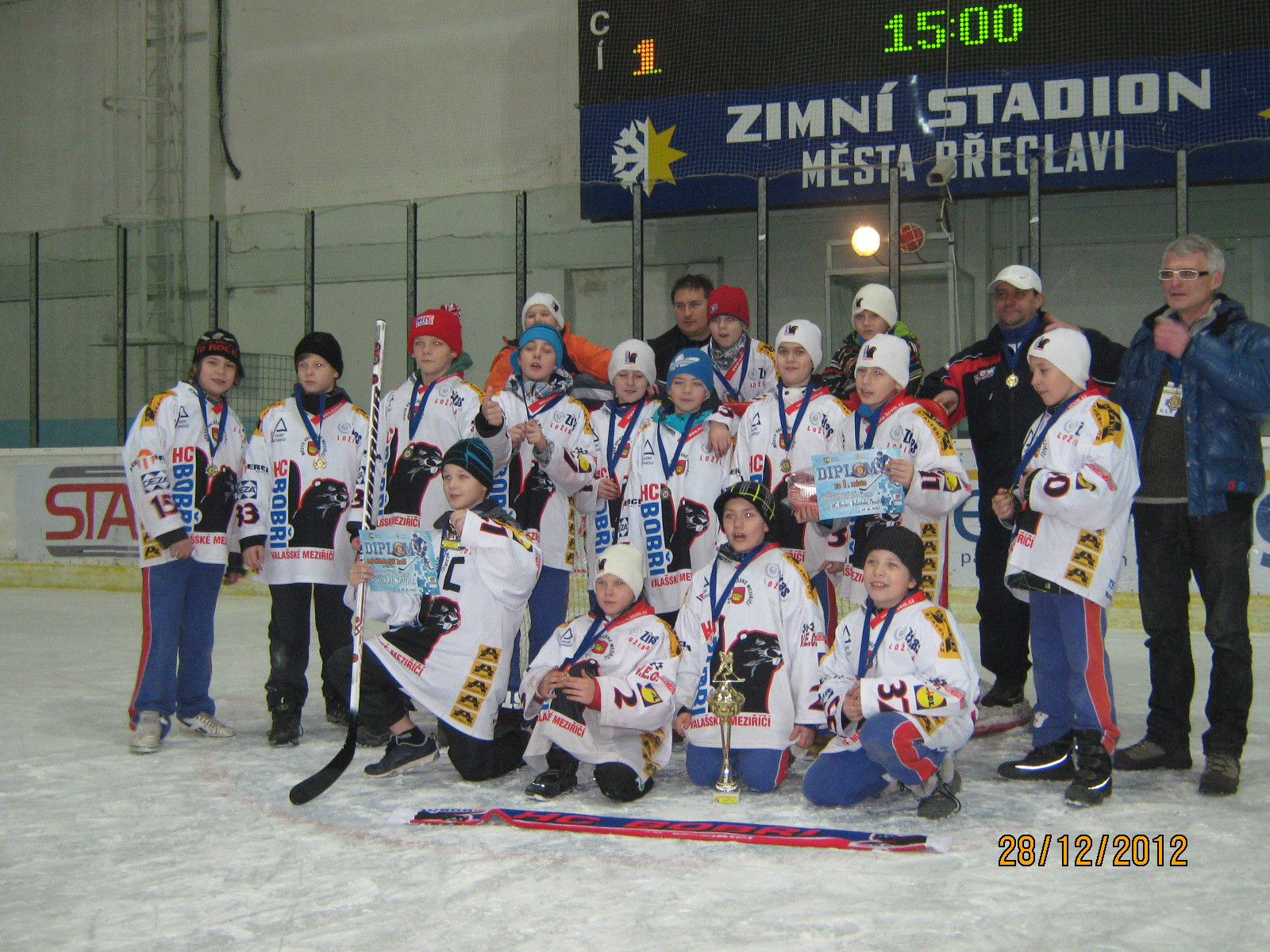 Vezmeme to pěkně od záčátku,který jsme vlastně ani nestihli. Kromě tradičního pozdního nástupu jsme tentokrát nestihli ani rozbruslení. Po ospalém začátku jsme se postupně dostávali do brankových šancí , ale ne a ne dát gól. Soupeř na sebe během první třeiny upozornil pouze tvrdou hrou za hranici pravidel. Ke konci první třetiny šli naši borci do vedení brankou Lukáše Adámka. Jednička na ukazateli asi popudila domácího časoměřiče, který první třetinu zkrátil o pět minut, čehož si k údivu nevšimli naši trenéři (byli tam jen čtyři). V druhé třetině už tak slepí rozhodčí nepískali vůbec nic,ofsajdy,zákazané uvolnění,zákeřné fauly,oplácení,prostě nic.Mimo toho ,že ve druhé třetině nepadl gól ,lze za úspěch považovat zdraví našich dětí. Do třetí třetiny jsme vletěli a zásluhou Jirky Brodka to bylo 2-0. Drama ze zápasů se pokusili udělat rozhodčí a po sérii hrubých faulů na naše hráče soupeř snížil na 1-2.Další prúnik Brodka zakončil dorážkou z brankoviště Vojta Frieb.Utkání do klidného konce nasměroval tvrdou ranou Vojta Pernický.V závěru stihl soupeř jen korigovat stav na kobnečných 2-4.